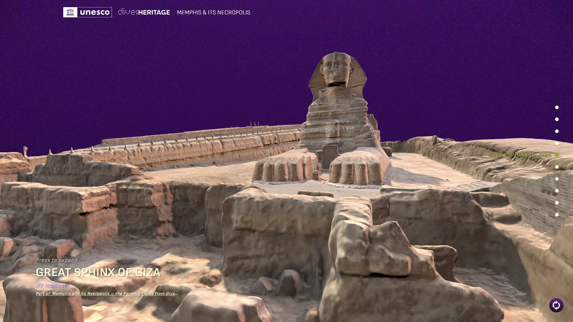 Cada localización ha sido seleccionada por su valor histórico y cultural, y cuenta con contenidos desarrollados específicamente para facilitar su comprensión y contextualización. Por ejemplo, el entorno de las pirámides de Guiza permite al usuario recorrer una línea de tiempo interactiva con narrativas sobre su construcción, su simbología funeraria y detalles arquitectónicos reconstruidos en 3D.