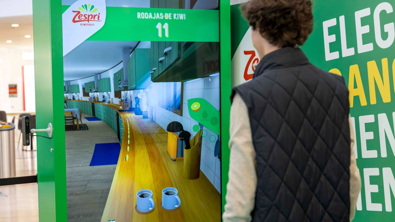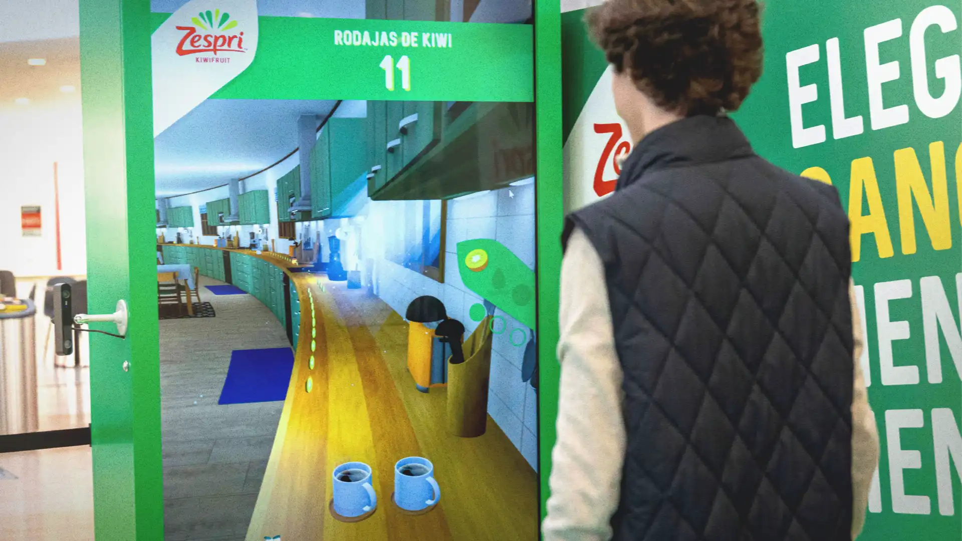 La primera parte de la experiencia desarrollada consistía en un videojuego tipo endless runner en el que los usuarios tomaban el control de uno de los dos kiwis, personajes representativos de la marca Zespri, donde los participantes debían moverse físicamente para avanzar, recogiendo rodajas de kiwis Zespri mientras evitaban obstáculos en una cocina virtual. Este dinámico recorrido reforzó el mensaje de que cada pequeña elección saludable cuenta.